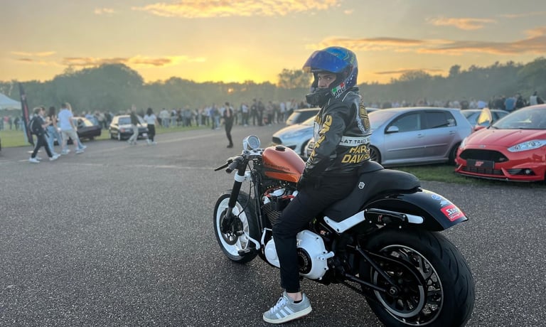Seine Rennmaschine? Eine Harley Sport Glide 2021, modifiziert auf 114 cm³ mit 149 PS – komplett selbst aufgebaut und optimiert in Zusammenarbeit mit Don Performance Bremen. Jeder Motor, jede Anpassung trägt Lucas persönliche Handschrift: gefertigt mit technischem Know-how, Leidenschaft für V-Twin-Power und jahrelanger Erfahrung im Harley-Tuning.
